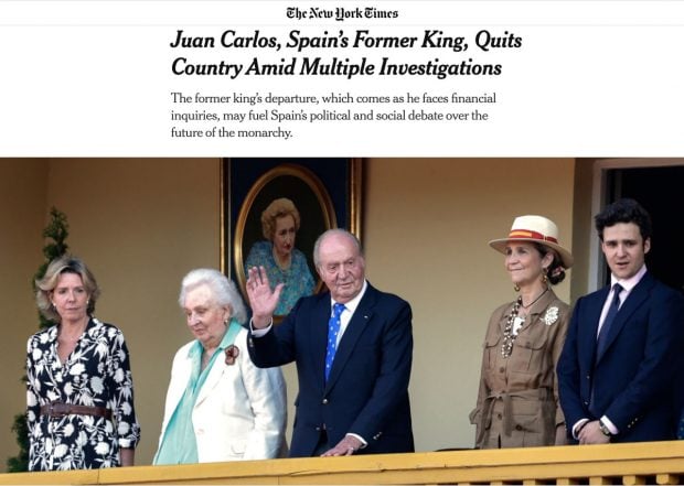 The New York Times afirma que el Rey Emérito «abandona el país en medio de múltiples investigaciones «. «La salida del ex Rey de España anunció el lunes que abandonaba su país en medio de una investigación judicial española sobre un lucrativo contrato comercial y una investigación separada sobre lavado de dinero y evasión de impuestos en Suiza», recoge el medio norteamericano.