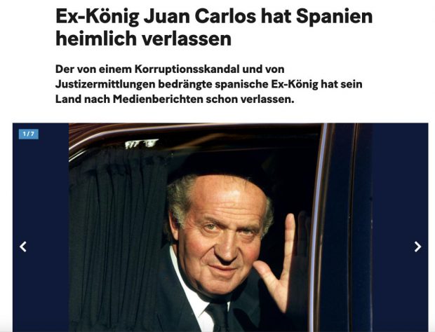 Otro diario teutón, en este caso 20 Minuten, informa de que «El ex Rey Juan Carlos ha abandonado en secreto España». «El ex Rey español, que ha sido golpeado por un escándalo de corrupción e investigaciones judiciales, ya ha abandonado su país según informes de los medios», señala en su pieza.