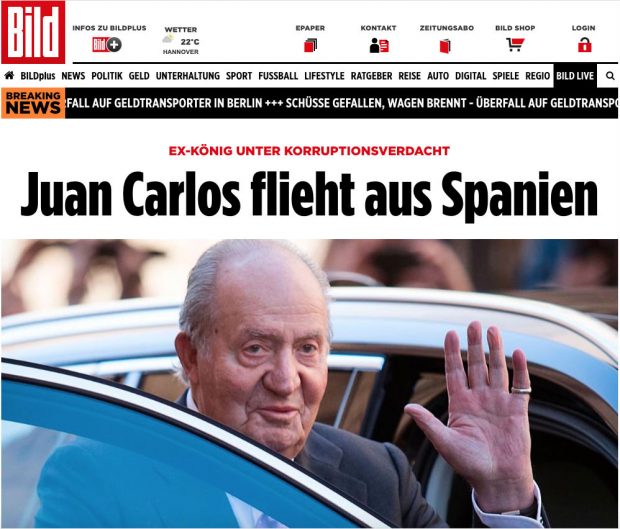 Bild es más directo en su noticia principal sobre el Rey Emérito: «Juan Carlos huye de España». El diario alemán le señala como «sospechoso de corrupción». «El ex Rey de España, Juan Carlos I (82) deja España para vivir en otro país, ¡en medio de un escándalo financiero!», añade en su pieza.