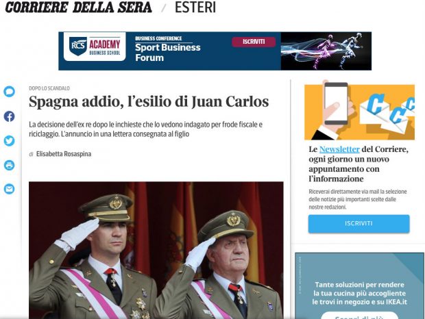 El diario italiano Corriere della Sera lleva en portada el «Adiós a España, el exilio de Juan Carlos». «La decisión del ex Rey después de investigaciones que lo ven investigado por fraude fiscal y lavado de dinero. El anuncio en una carta entregada al hijo», recoge en el subtitular de esta noticia.