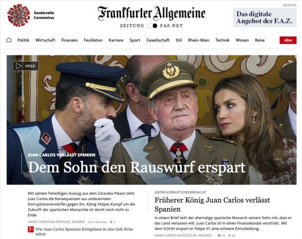 El diario alemán Frankfurter Allgemeine abre su portada con la salida del Rey Juan Carlos I de España. «Salvó al hijo de echarlo», destaca en su titular. «Con su partida voluntaria del Palacio de la Zarzuela, Juan Carlos dibuja las consecuencias de las continuas acusaciones de corrupción en su contra. La lucha del Rey Felipe por el futuro de la monarquía española no termina allí», recoge en su subtitular.