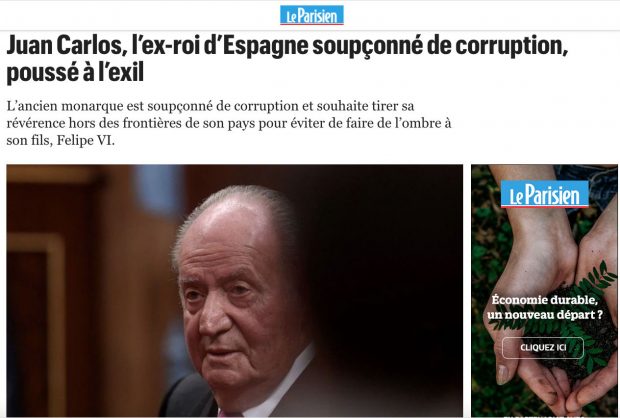 Le Parisien lleva como titular «Juan Carlos, el ex Rey de España sospechoso de corrupción, forzado al exilio». «El ex monarca es sospechoso de corrupción y desea retirarse más allá de las fronteras de su país para evitar eclipsar a su hijo, Felipe VI», añade en su pieza el diario galo.