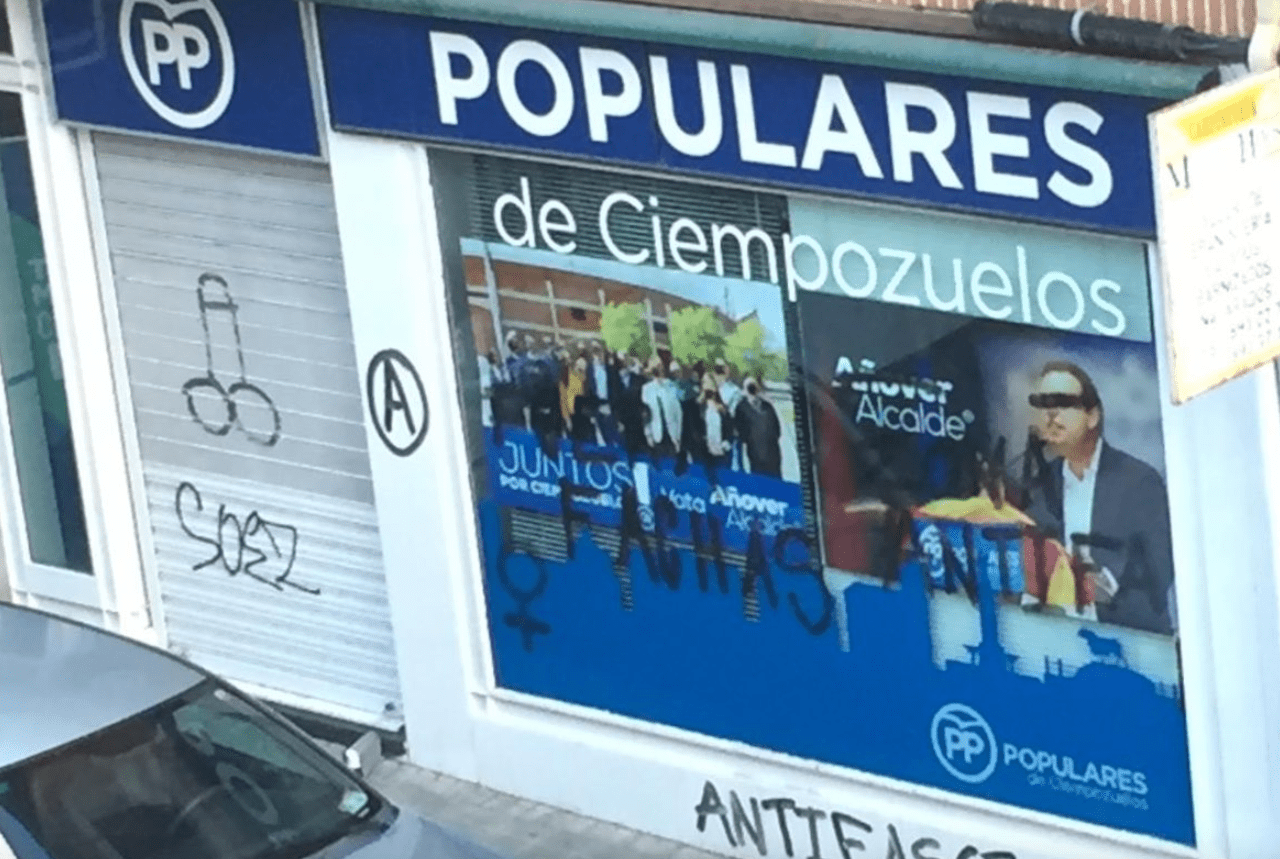 Este miércoles la fachada de la sede del PP de Ciempozuelos, en Madrid, ha aparecido llena de pintadas contra la formación. «Fuera fachas», «zona antifa», así como un dibujo hecho con spray de un órgano sexual masculino en el cierre de la puerta y el rostro del candidato a la Alcaldía, Héctor Añover, ha aparecido tachado con pintura negra.