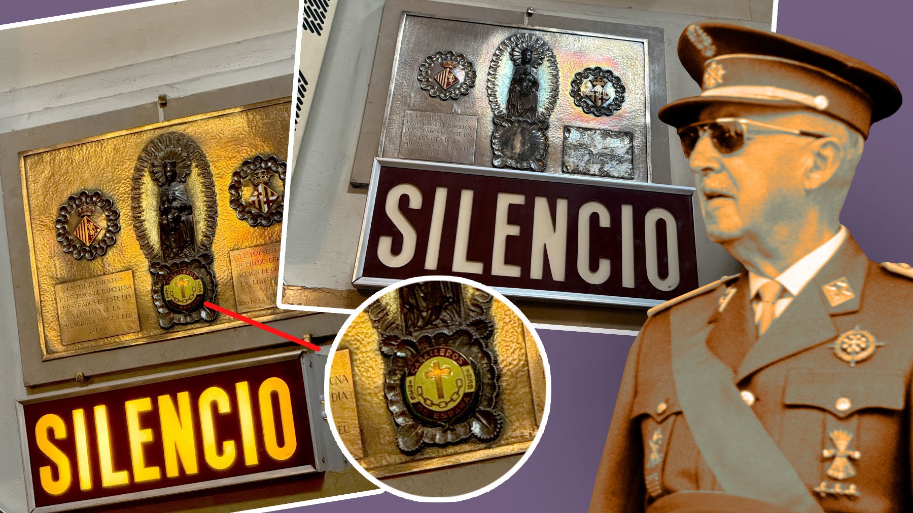 La pequeña placa lleva colgada 86 años junto al camarín de la Virgen del Pilar. Sin embargo, de la noche a la mañana, la cruz y la inscripción han desaparecido dejando los dos huecos vacíos, tras la petición de un ciudadano que mandó un escrito al Gobierno de Aragón para que retirase la placa por considerarla apología de la dictadura de Franco y contraria a la Ley de Memoria Democrática.