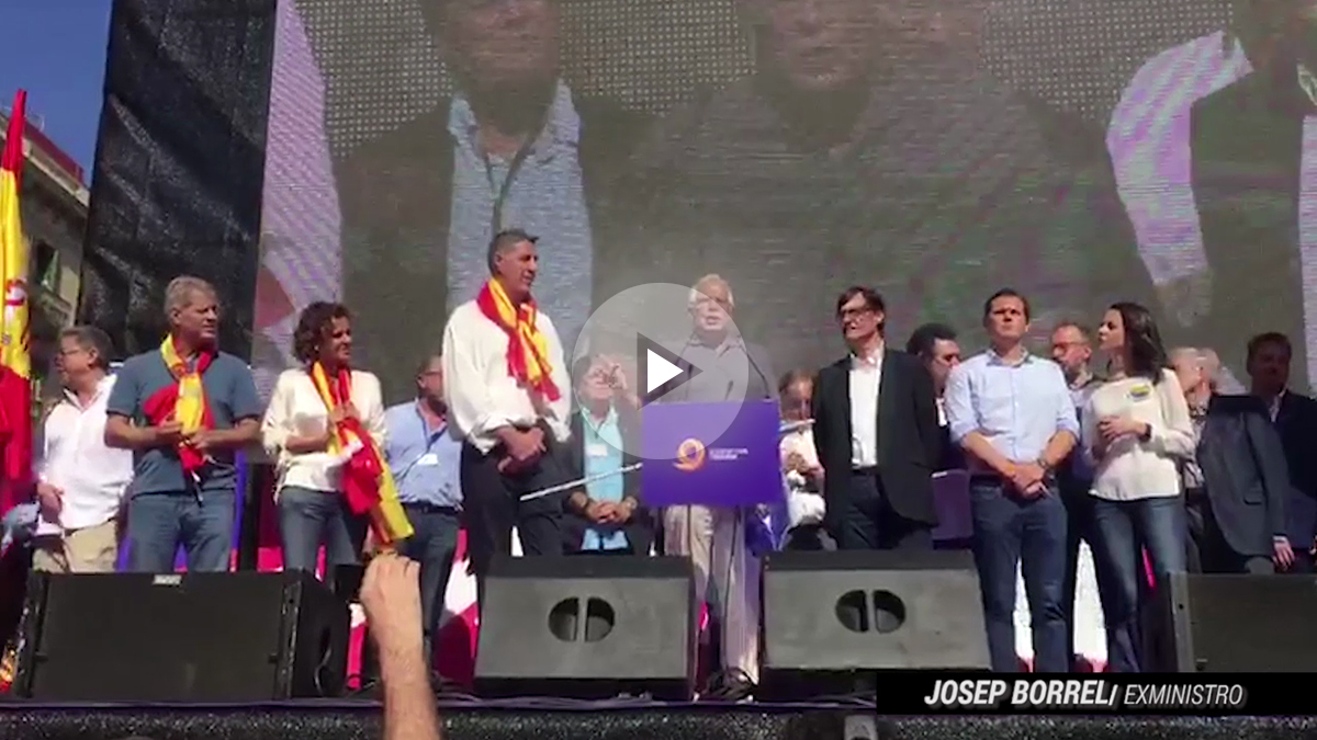 Borrell, con una bandera europea en la mano, dijo que «Esta es nuestra estelada», e hizo un «llamamiento a la serenidad y a la razón», ya que a su juicio «la convivencia está rota en este país» y «hay que rehacerla» para evitar que se llegue a un «enfrentamiento civil».