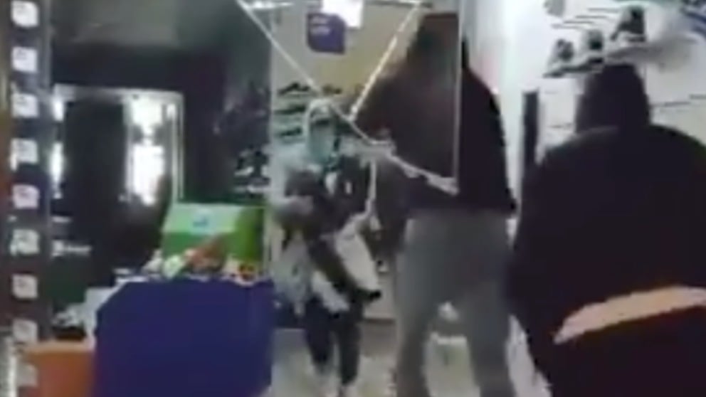 El mejor ejemplo fue una conocida cadena de calzado deportivo, especializada en zapatillas de alta gama de marca con costes superiores a los 100 euros por par. Las dantescas escenas que grabaron algunos vecinos a las puertas del establecimiento muestran a jóvenes, algunos encapuchados y otros con cascos de moto, accediendo a la carrera y entre cristales al local. Arrasaron con todo.
