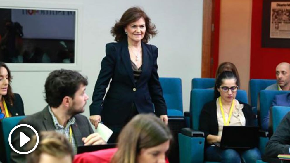 La vicepresidenta Carmen Calvo ha llamado a "redoblar los esfuerzos" de movilización el 8 de marzo, contra el avance "peligroso y enloquecedor" de la extrema derecha, en referencia a Vox, que podría convertirse en mayoritaria -ha dicho-, una vez que los partidos conservadores han "abandonado sus posiciones y se confunden" con ella.