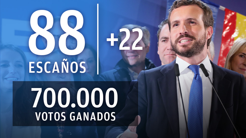 El PP, con sus 88 escaños, es uno de los vencedores de la noche electoral. Pese no a no ganar las elecciones, el partido que lidera Pablo Casado ha sumado 700.000 nuevos votantes y ha recuperado 22 escaños, el 33% de los que perdió aquel aciago 28 de abril. Seis meses después, Casado se consolida como líder indiscutible del partido y de la oposición.