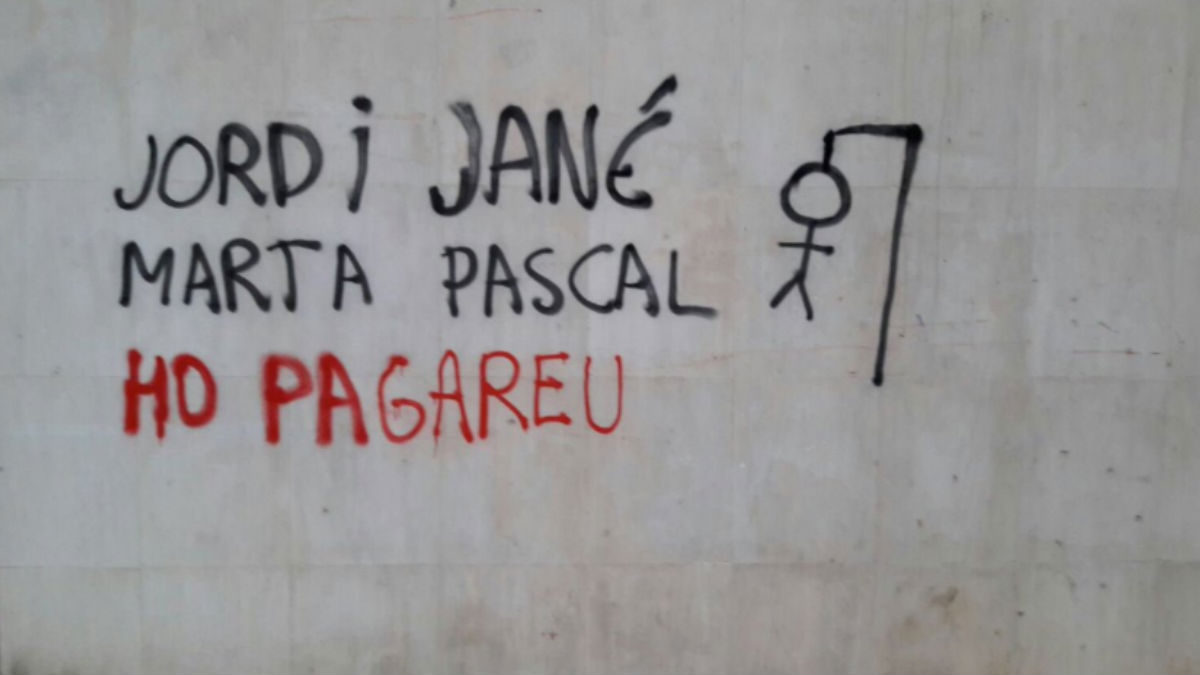 El Partido Demócrata Catalán (PDECAT), la antigua Cònvergencia, ha denunciado este martes las pintadas de independentistas, de tono amenazante, aparecidas en la sede del distrito de Horta (Barcelona) en contra del presidente de la formación, Artur Mas, la coordinadora, Marta Pascal, y el consejera del Interior, Jordi Jané. Fuentes del partido aseguran que acaban de denunciar ante los Mossos d’Esquadra estas pintadas, que han aparecido un día después de las detenciones, por parte de la policía catalana, de simpatizantes de la CUP que habían desoído una citación de la Audiencia Nacional.