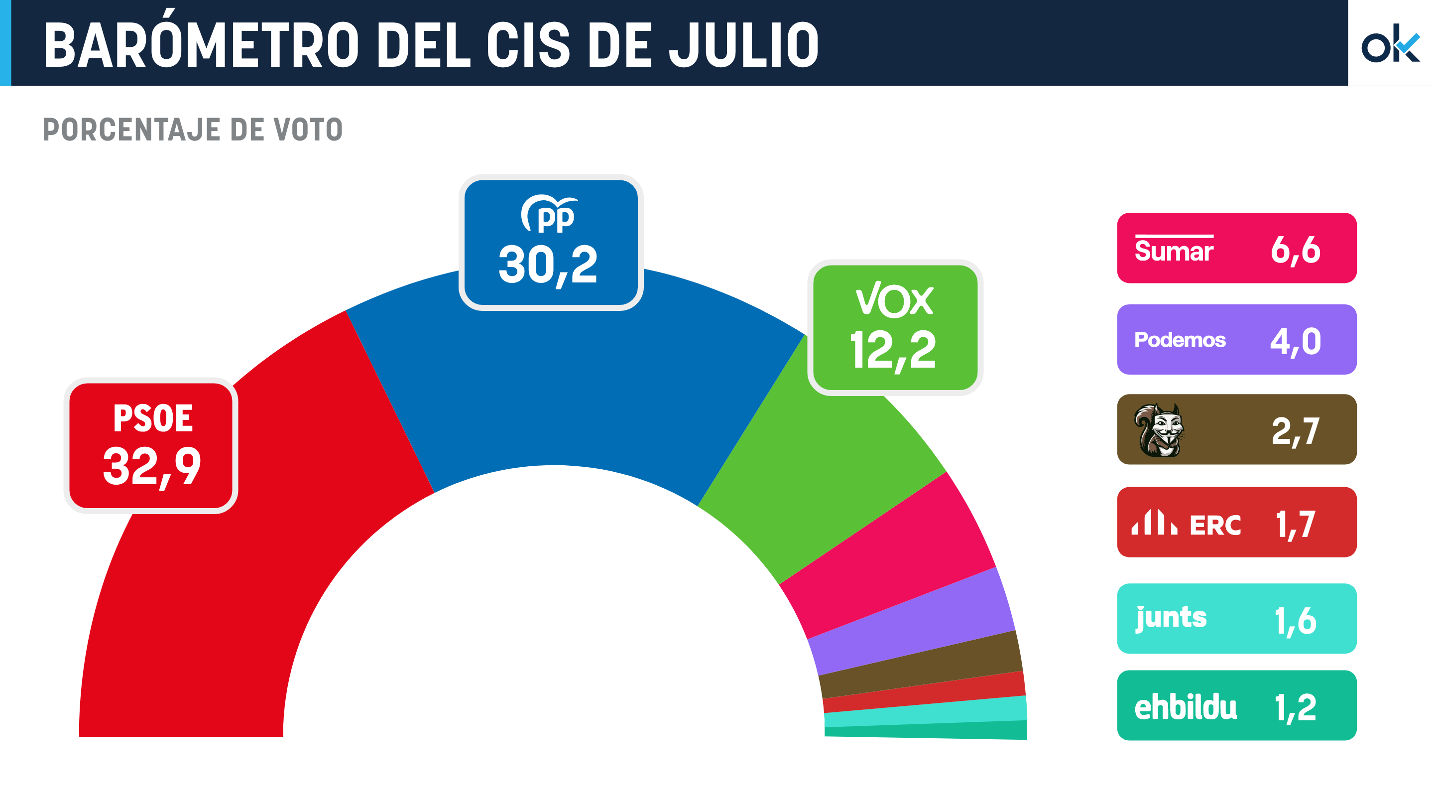 La encuesta refleja que el PSOE ganaría las elecciones generales con un 32,9% de los votos. Otorga al PP un 30,2% de las papeletas, 5 décimas menos que en el barómetro anterior. Vox sería la tercera fuerza con 12,2% de los votos y Sumar, cuarta, con el 6,6% de las papeletas. Podemos obtendría el 4%; Se Acabó La Fiesta (del faker profesional Alvise), el 2,7%. Los independentistas de ERC y Junts prácticamente empatarían, con un resultado de 1,7% y 1,6%, respectivamente. Bildu y PNV también obtendrían un porcentaje de voto similar, 1,2% y 1,1%.