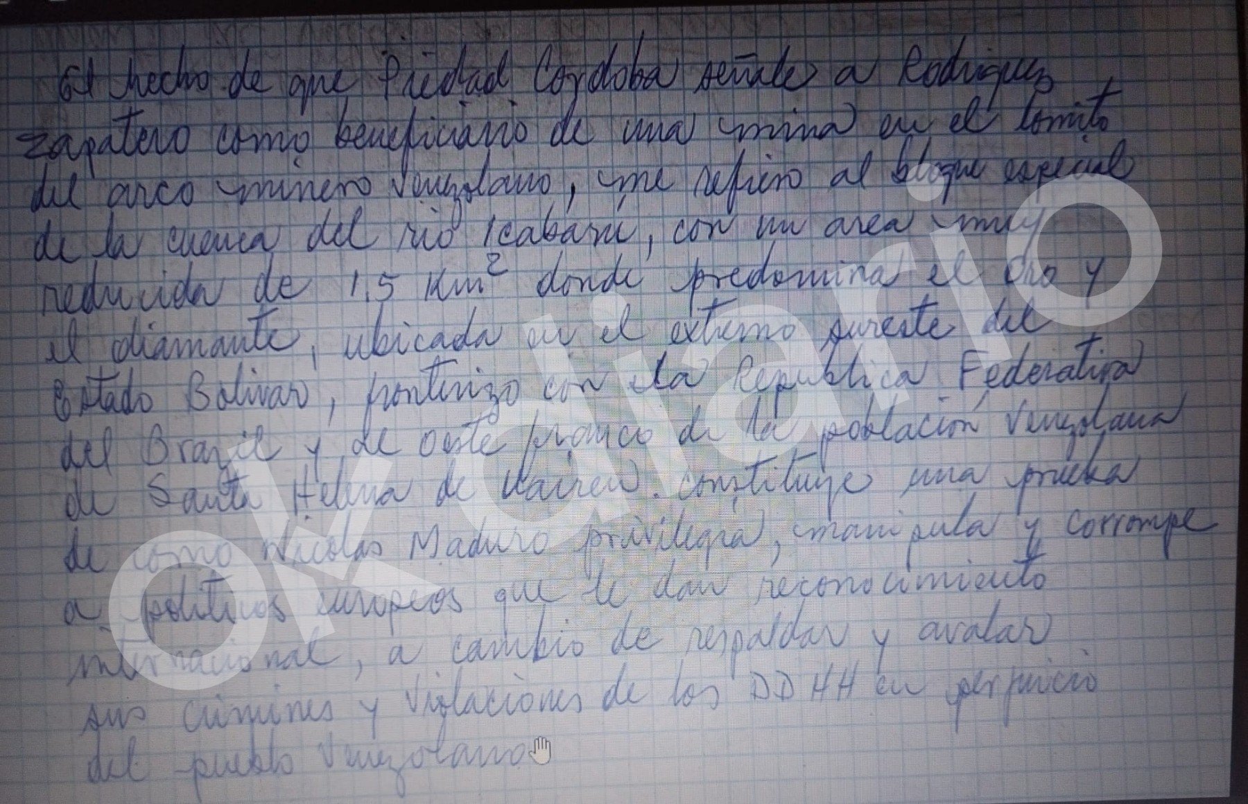 En esas notas explicaba que Piedad Córdoba señaló a Zapatero como beneficiario de una mina en el lomito del arco minero venezolano. «Constituye una prueba de como Nicolás Maduro privilegia, manipula y corrompe a políticos europeos que le dan reconocimiento internacional, a cambio de respaldar y avalar sus crímenes y violaciones de los Derechos Humanos en perjuicio del pueblo venezolano», explicó en el manuscrito.