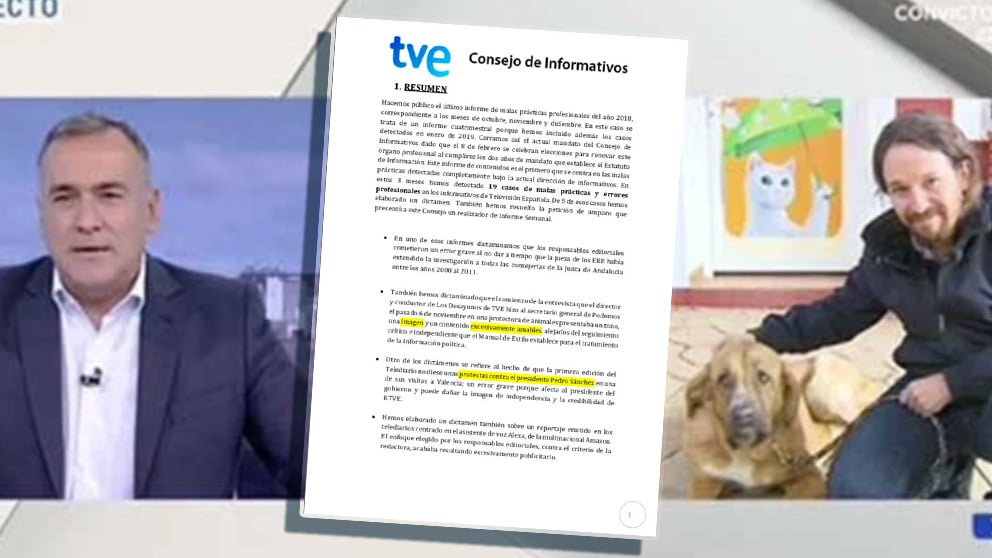 El Consejo de informativos de TVE denuncia hasta 19 casos de las malas prácticas e imparcialidad en el tratamiento informativo de la televisión pública. Este polémico Consejo, creado en la etapa anterior, ha analizado desde la omisión de los abucheos e insultos al presidente del Gobierno, Pedro Sánchez, pasando por la imagen ‘excesivamente amable’ de Pablo Iglesias junto a un perro en una entrevista, hasta la falta de pluralidad con VOX.