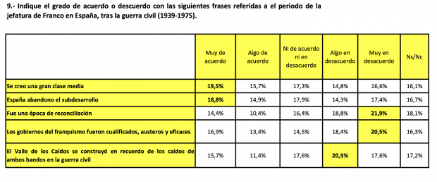 Finalmente, la tesis de que el Valle de los Caídos fue construido en recuerdo de los caídos de ambos bandos obtiene un 27,1% de acuerdo, frente a un 38,1% de desacuerdo. Los datos evidencian que las valoraciones favorables se concentran en factores socioeconómicos, mientras los aspectos políticos o simbólicos del régimen generan mayor contestación.