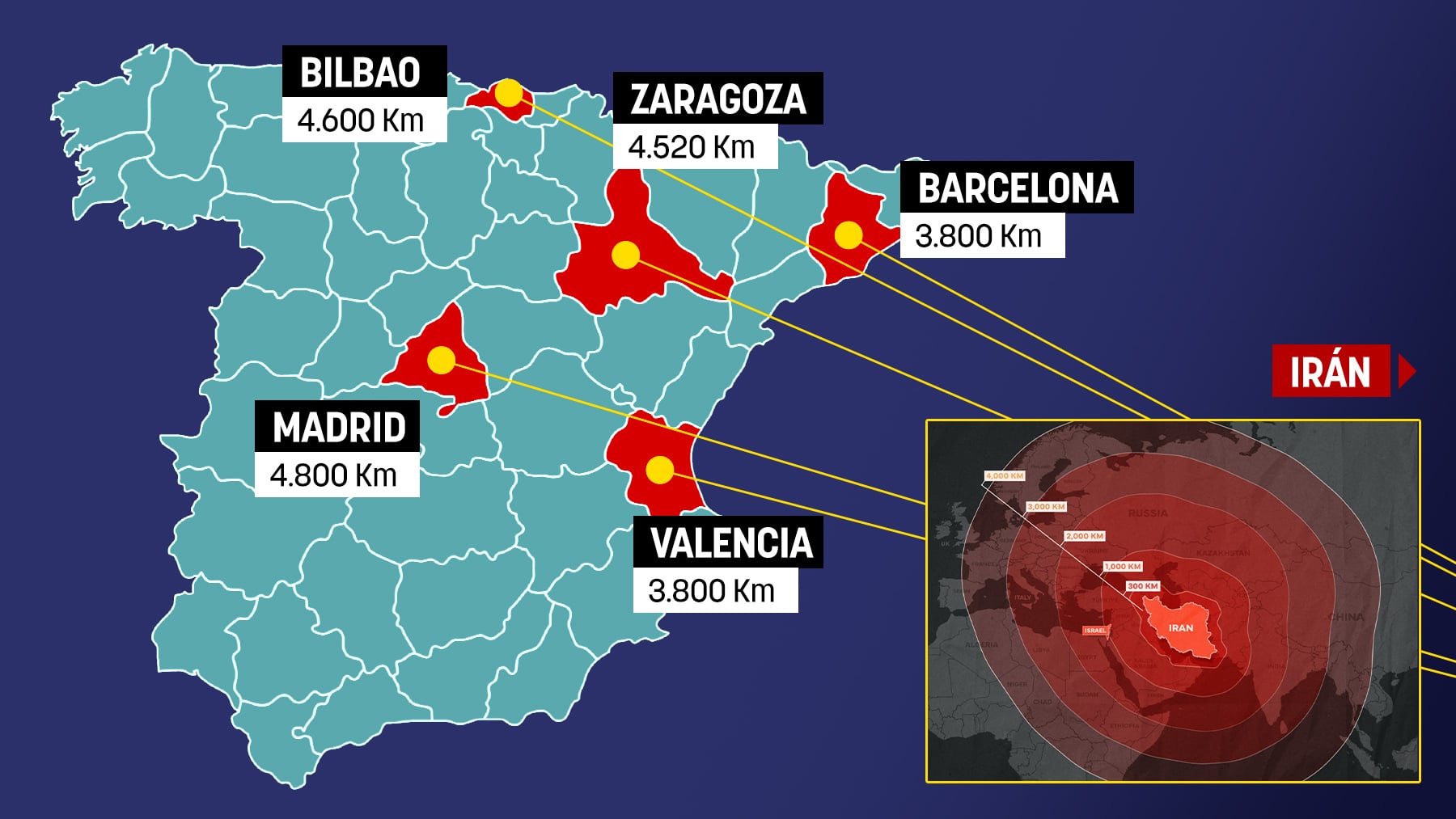 - Teherán y Madrid: 4.800 kilómetros.
