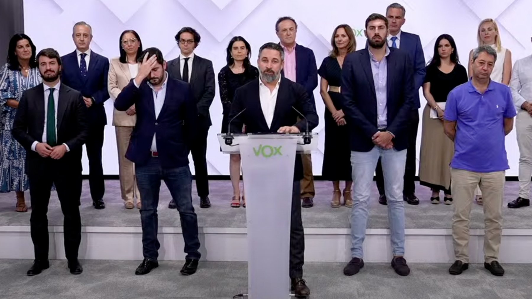 Finalmente, sobre las 21:30 horas de este jueves, comparecía públicamente Santiago Abascal para anunciar la decisión, flanqueado por los cuatro presidentes de Vox en segunda fila. «Una de las decisiones más importantes para Vox», subrayó Abascal: la que pasaba por abandonar la cuota de poder autonómico que había logrado su formación sólo un año después de haberla obtenido, dos en el caso de Castilla y León. La expresión del ya ex vicepresidente de la Comunidad Valenciana (destituido ya por Mazón adelantándose a su dimisión) que muestra la imagen que ilustra esta información describe su falta de adscripción a esta medida. Tras la comparecencia, Barrera evitó abrazar a Abascal y le regateó con un toque en el hombro.