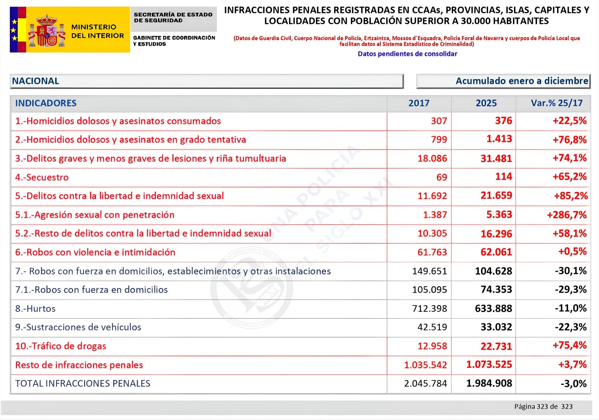 El informe del Ministerio del Interior sólo recoge la comparativa de 2025 con 2024. Sin embargo, la asociación Una Policía para el Siglo XXI ha realizado un gráfico comparando las cifras de 2025 con las de 2017, un año antes de que gobernara Sánchez, para que la ciudadanía sepa «qué situación había entonces y cómo ha acabado con Marlaska».