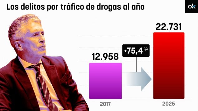 Los delitos por tráfico de drogas se han disparado un 75,4% desde que Fernando Grande-Marlaska es ministro del Interior, pasando de 12.958 en 2017 a nada menos que 22.731 en 2025. Así se desprende del último balance de la criminalidad del propio Ministerio, publicado recientemente.