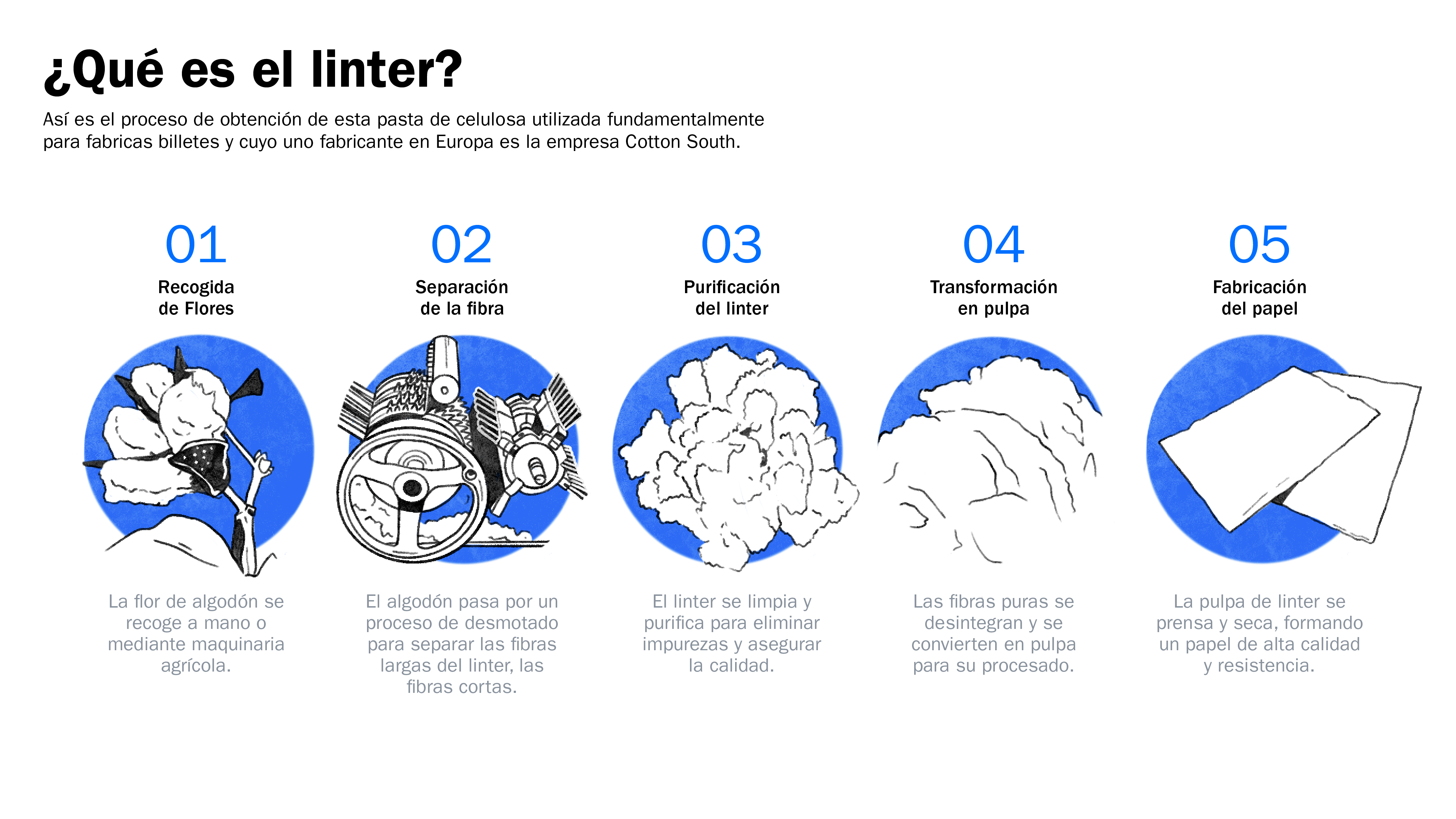 Durante la visita nos muestran varias bolsas que permiten conocer la profundidad y complejidad de todo el proceso. Bolsa 1: flor de algodón. China, India, Brasil, EE. UU., Pakistán, Australia y Turquía son los principales países productores de algodón. Sacan al mercado más de 20 millones de toneladas métricas al año. Bolsa 2: algodón desmotado. Sin cáliz y ramaje, la bola de la fibra mantiene en su interior las semillas. Bolsa 3: fibra larga blanca. Sin semillas, las hebras de algodón se destinan a la industria textil. Bolsa 4: semillas con pelillos adheridos. Con el grano se produce aceite de algodón, base de la alimentación para cientos de millones de personas en Asia, Oriente, África y América. Bolsa 5: linter. Así se llama a ese pelo corto de algodón que está pegado a la semilla. Estas borras del algodón son la materia prima de Cotton South, la única empresa en Europa que fabrica exclusivamente la pasta de celulosa imprescindible para hacer los billetes, el papel de arte y el de los test médicos.