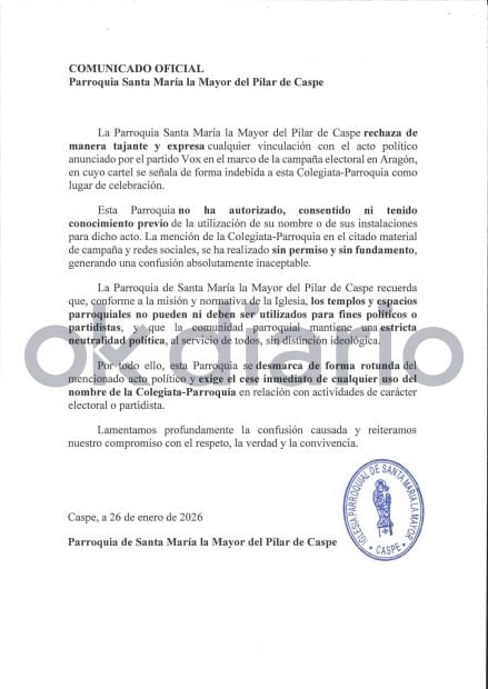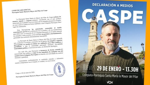 «La parroquia de Santa María la Mayor del Pilar de Caspe recuerda que, conforme a la misión y normativa de la Iglesia, los templos y espacios parroquiales no pueden ni deben ser utilizados para fines políticos o partidistas, y que la comunidad parroquial mantiene una estricta neutralidad política, al servicio de todos, sin distinción ideológica», añaden.