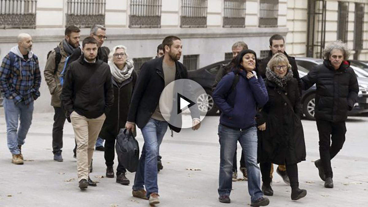 La diputada de la CUP en el Parlamento de Cataluña Anna Gabriel, la senadora de ERC Mireia Cortés y el diputado en el Congreso de En Comú Podem Marcelo Expósito, acompañados de otros parlamentarios y de varias decenas de personas han mostrado este martes su apoyo, a las puertas de la Audiencia Nacional, a los cinco investigados por quemar fotos del Rey que serán interrogados por el juez Fernando Andreu. Dos de ellos han sido arrestados en el autobús en el que viajaban camino a Madrid con otros simpatizantes de su causa.