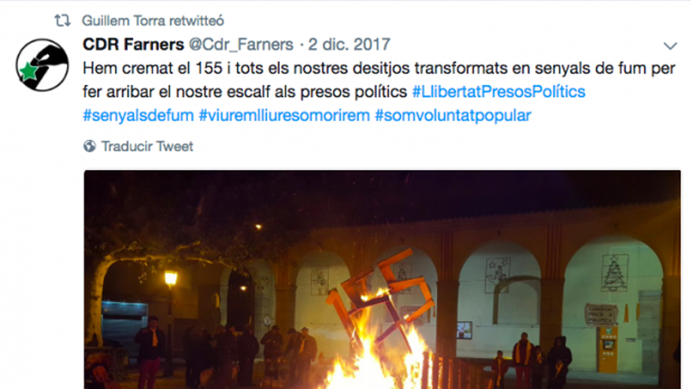 Por su parte, su hijo Guillem también hace propaganda de los CDR en las redes sociales, sobre todo del comando de Santa Coloma de Farnés (Gerona), localidad de la que proviene la familia de Torra. Por ejemplo, el pasado 2 de diciembre, Guillem difundió la quema de unas maderas con forma del número 155, en alusión al artículo de la Constitución aplicado por el Gobierno, con apoyo de PSOE y Ciudadanos, para intervenir Cataluña tras el golpe secesionista. Ese mensaje del CDR de Farnés decía: «Hemos quemado el 155 y todos nuestros deseos se han transformados en señales de humo para hacer llegar nuestro calor a los presos políticos».