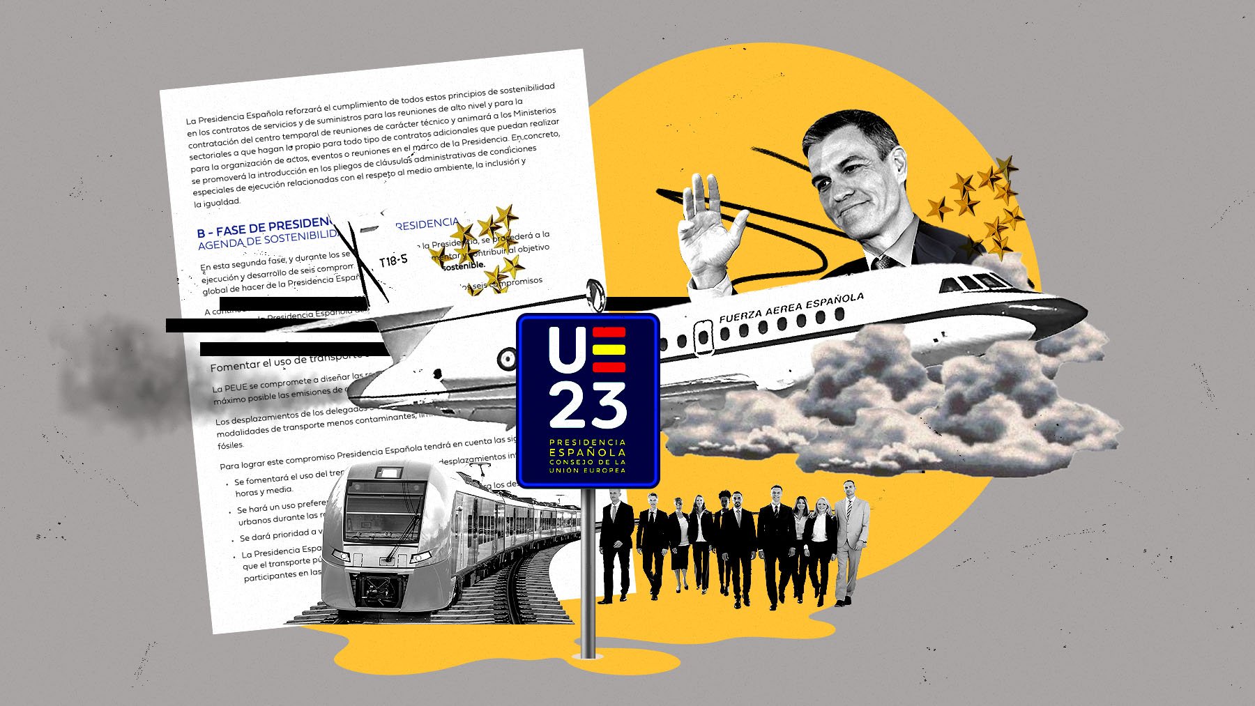 El Gobierno quiere que los cargos europeos que visiten España con motivo de la Presidencia española de la UE, que ha comenzado el 1 de julio, se desplacen en medios de transporte «sostenibles» y de bajas emisiones. Así se recoge en el llamado Plan de sostenibilidad, elaborado por Moncloa y otros siete ministerios, en el que se indica que «los desplazamientos de los delegados o delegadas y/o personas invitadas se harán en modalidades de transporte menos contaminantes, limitando el consumo de combustibles fósiles». Para lograr ese compromiso, el Gobierno pide que se recurra al tren de alta velocidad «para desplazamientos inferiores a dos horas y media». Todo ello, cuando Sánchez se ha caracterizado por su particular afición por el Super Puma, el Falcon o incluso el jet privado para viajes de corta duración.