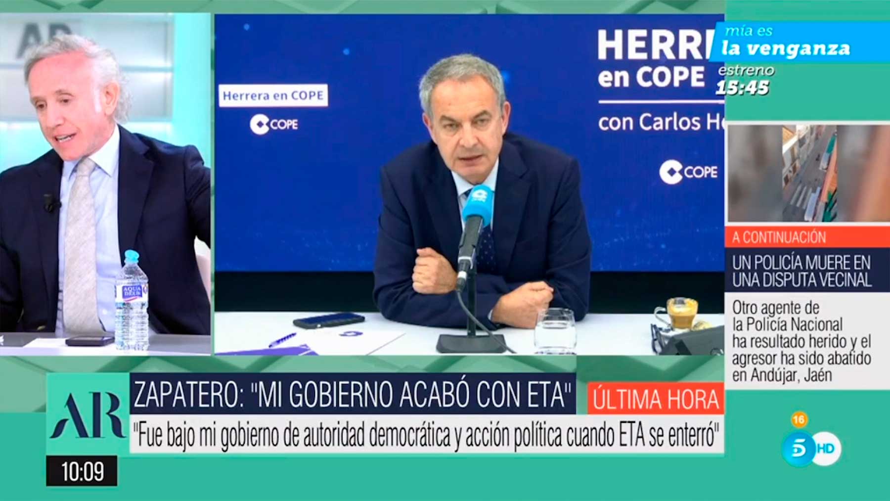Las palabras del ex presidente José Luis Rodríguez Zapatero de esta misma mañana alabándose a sí mismo como artífice del hecho de que ETA dejase de matar, ha estado sobre la mesa de la tertulia de El Programa de Ana Rosa, donde Eduardo Inda ha admitido que «el terrorismo de asesinar es verdad que se terminó», pero ha puntualizado de inmediato que «desgraciadamente» no descarta «que vuelva a existir porque ETA está en las instituciones y eso es una realidad».
