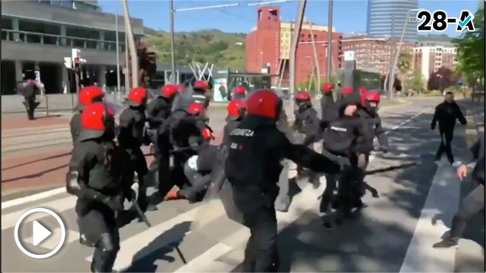 La Ertzaintza carga contra un grupo de proetarras que intentaban reventar una acto de VOX en Bilbao. "Españoles hijos de puta", "Vosotros fascistas sois los terroristas", "Alde hemendik (fuera de aquí)", y "la lucha es el único camino" han sido algunos de los gritos escuchados.