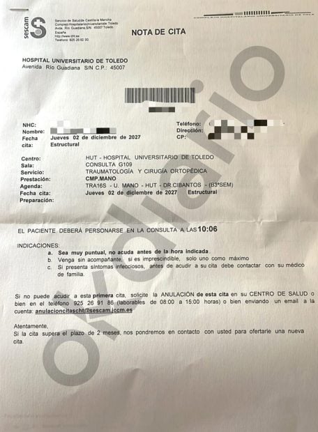 La sorpresa llega justo en el momento en que recibe una carta con el justificante de su volante en el que aparece la fecha de su citología con el especialista. Según puede leerse en el documento, Esteban ha sido citado para el jueves 2 de diciembre de 2027. Es decir, dentro de 669 días. O lo que es lo mismo, el paciente cuya dolencia puede degenerar en una enfermedad crónica de no ser tratada de manera «preferente», no vería al médico especialista en el área de traumatología hasta dentro de 22 meses.