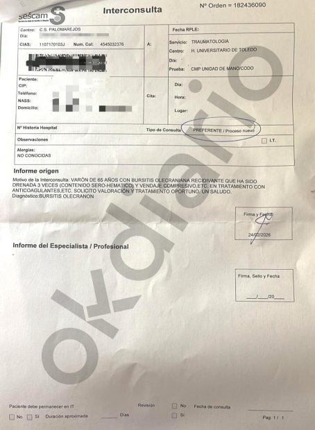 Tal y como refleja el documento, su médico de cabecera le tramitó ese mismo día una cita con el servicio de Traumatología y Cirugía Ortopédica del Hospital Universitario de Toledo. En el apartado en el que debía especificar el «tipo de consulta» de su paciente, el doctor señaló que su cita tendría carácter de «PREFERENTE», en mayúsculas. Es decir, según el informe, la consulta de Esteban con el especialista sería prioritaria. Ello, habida cuenta de que una cita con preferencia es así por razón de ser tratada en el menor tiempo posible, es decir, en un plazo de entre 7 y 15 días.