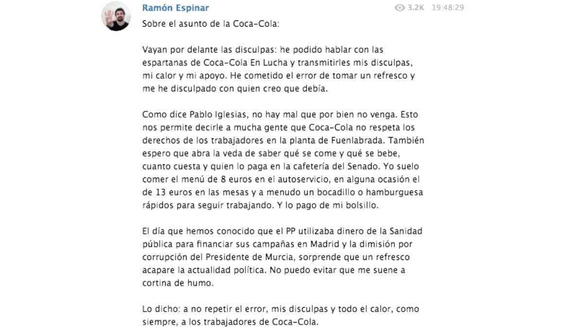 Así se ha mostrado el dirigente podemita para tratar de disculparse por haber consumido dos Coca-Colas en el Senado, después de que su partido pidiera que se dejara de consumir esta marca de refrescos tanto en la Cámara Alta como en el Congreso.