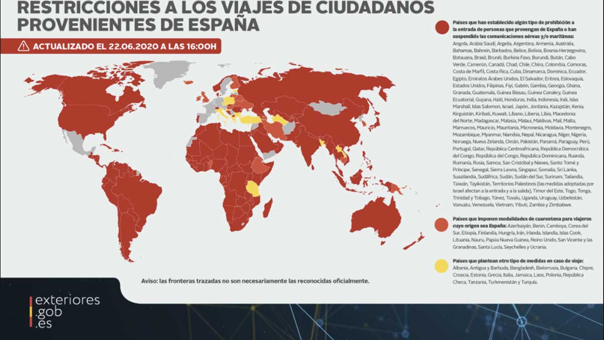 Un mapa del Ministerio de Exteriores español da una idea del desastre de la gestión del coronavirus llevada a cabo por el Gobierno de España. Mientras desde la Comunidad de Madrid Isabel Díaz Ayuso pide al Ejecutivo de Pedro Sánchez que exija a los turistas que lleguen al aeropuerto de Barajas haberse realizado un test PCR y demostrar que no entran en España infectados de coronavirus, en el resto del mundo, prácticamente la totalidad del planeta aplica sin miramientos restricciones a la entrada de españoles. En total, más de 150 países «han establecido algún tipo de prohibición a la entrada personas que provengan de España o han suspendido las comunicaciones áreas y/o marítimas» o «imponen modalidades de cuarentena para viajeros cuyo origen sea España».