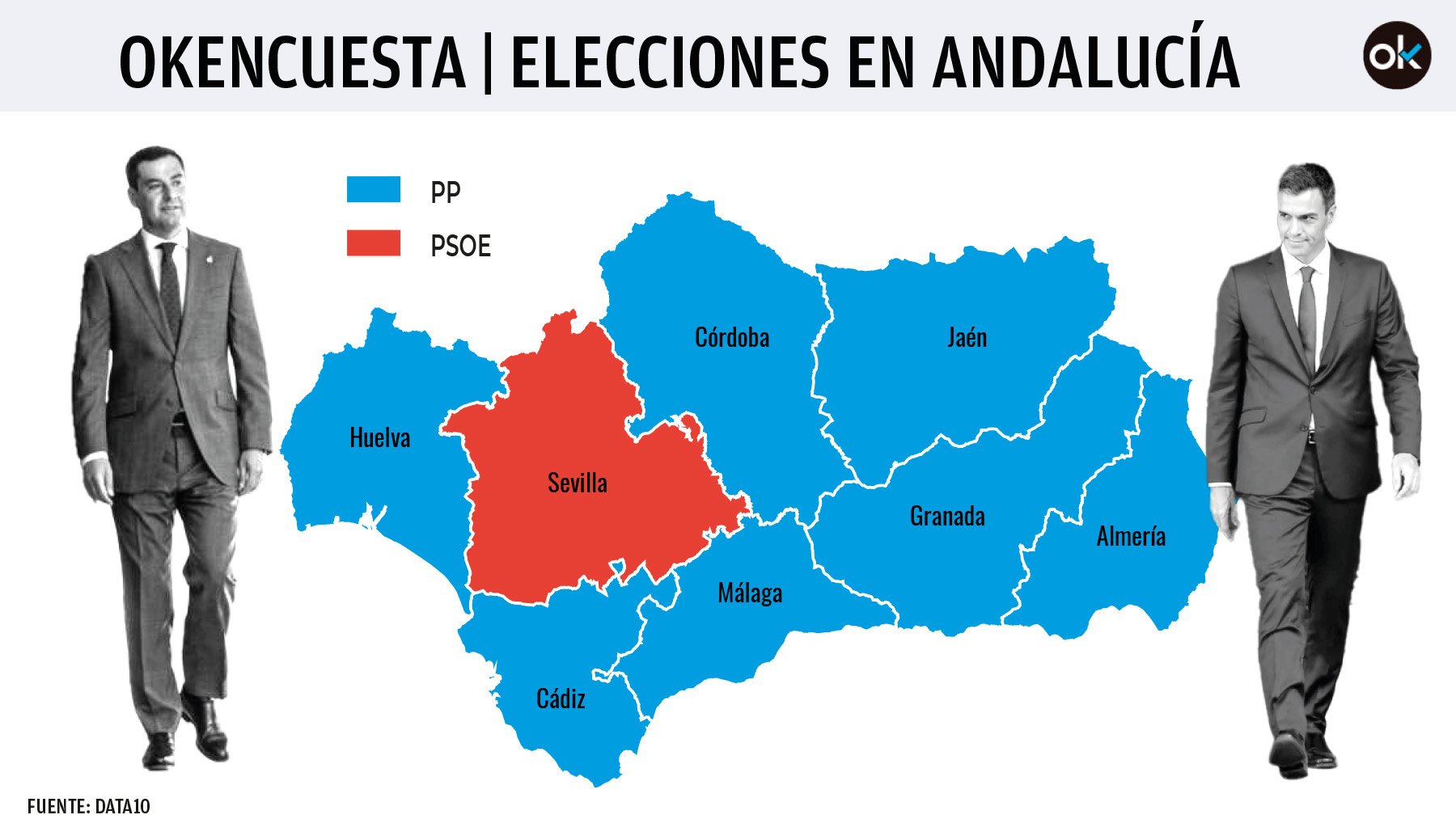 El Partido Popular arrasa al PSOE en Andalucía. Los resultados de la encuesta de Data10 para OKDIARIO consolidan el triunfo de Juanma Moreno en las elecciones del próximo 19 de junio, con 41 escaños (33,8% del voto). El resultado es insuficiente para que Moreno cumpla su objetivo de gobernar en solitario, pero le permite retener la presidencia de la Junta con el apoyo de Vox (25 diputados, 19,8%). La diferencia con el PSOE es apabullante. Los socialistas se mantienen estancados desde hace semanas en los 34 diputados (27,1% de votos) y con pocas perspectivas de ilusionar a su electorado. Por provincias, el triunfo del PP es aún más revelador, pues el partido se impone en todas ellas, a excepción de Sevilla (donde la diferencia con el PSOE es de sólo dos puntos). Vox supera a los socialistas en Almería.