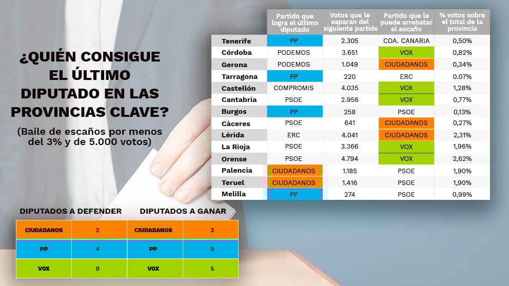 Esas circunscripciones -expuestas en el gráfico adjunto- son Tenerife, Córdoba, Gerona, Tarragona, Castellón, Cantabria, Burgos, Cáceres, Lérida, La Rioja, Orense, Palencia, Teruel y Melilla. Y en todas ellas el movimiento de voto cruzado hacia otro de los partidos del centroderecha tendría que suponer menos del 3% del voto total y menos de 5.000 papeletas. Es decir, que no se trataría de ninguna cuestión utópica.