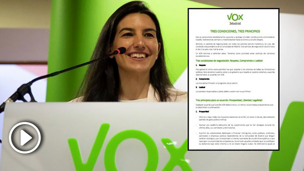 Desde la Asamblea de Madrid, Monasterio ha hecho público el documento ‘Tres condiciones, tres principios’ donde deja claras sus exigencias a Isabel Díaz Ayuso (PP) y a Ignacio Aguado (Ciudadanos). La gran novedad pasa por la exigencia de que «las tres partes firmarán un programa único común». Así mismo, las tres condiciones de negociación que fijan son el respeto, el compromiso y la lealtad.