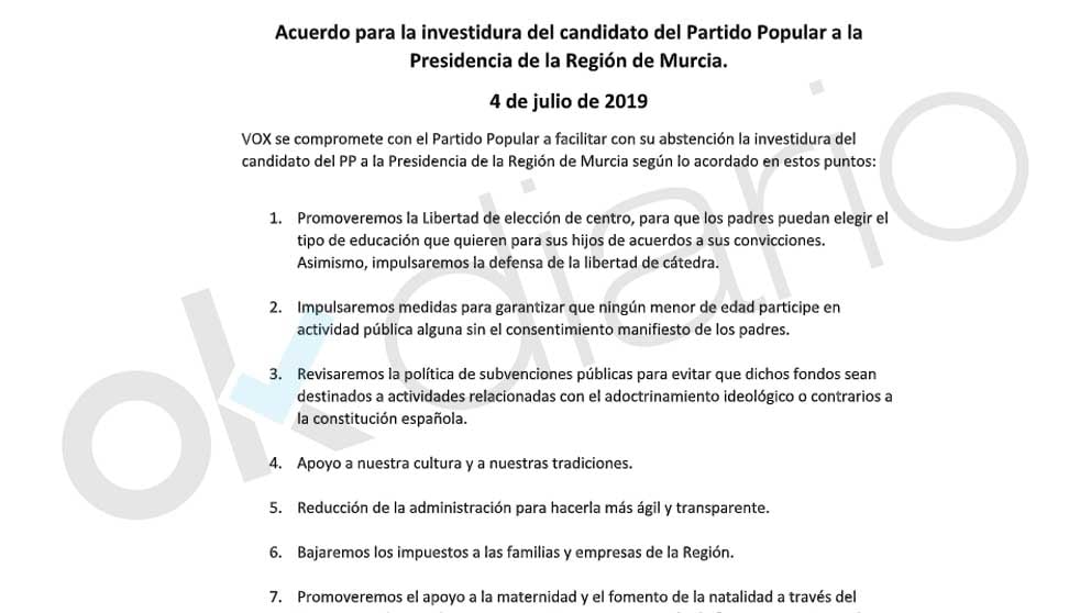 Esta es la literalidad del “Acuerdo para la investidura del candidato del Partido Popular a la Presidencia de la Región de Murcia.