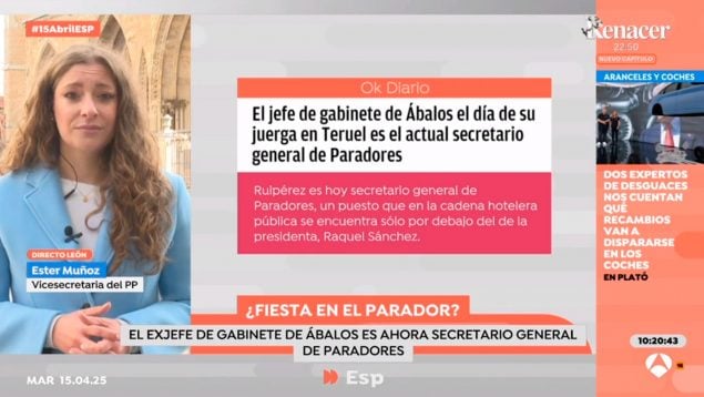 En una entrevista en el programa Espejo Público de Antena 3, Ester Muñoz ha respondido con firmeza tras ser cuestionada sobre si desde el PP «dan por hecho que ocurrió algo» en el Parador de Teruel. «Nosotros sabemos que hay empleados que trabajaban en aquel momento, que dicen que se produjo algo muy extraño y que hubo una reunión con gente y que evidentemente se debió quedar bastante destrozada la habitación», ha asentido la vicesecretaria de Educación y Salud popular.