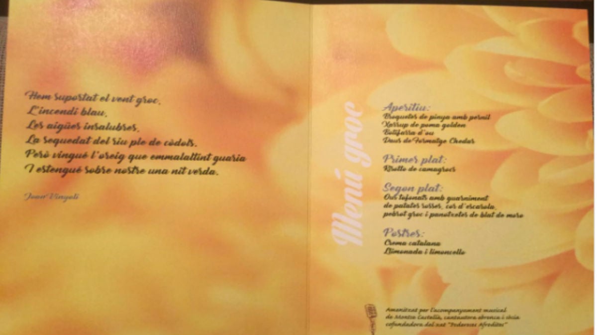 Así lo ha explicado Pons, a través de las redes sociales, donde ha colgado la octavilla con el menú que degustaron los cuatro comensales. La cena no sería noticia si no fuera porque, ingeniosamente, en la cocina hicieron un menú «amarillo», el color que identifica a los dirigentes encarcelados.