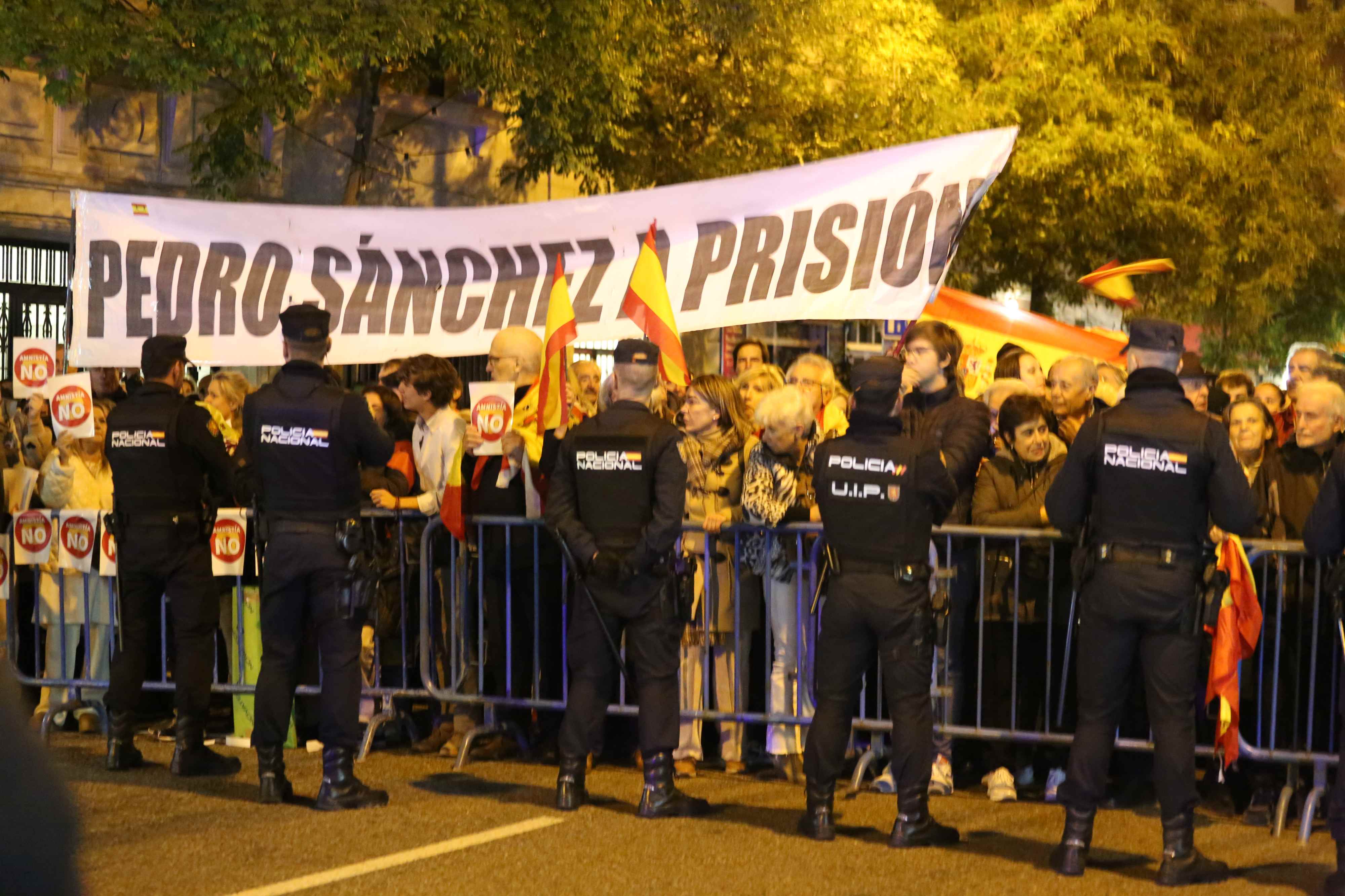 Esta imagen fue difundida por la asociación Hazte Oír con motivo de una concentración de noviembre de 2023 que tuvo lugar en las cercanías de la sede del PSOE en Madrid para «protestar por los acuerdos de Gobierno con los independentistas y la traición de Pedro Sánchez a España». Estos acuerdos implicaron la amnistía para los golpistas del 1-O a cambio del apoyo de los partidos secesionistas catalanes a la investidura de Sánchez.