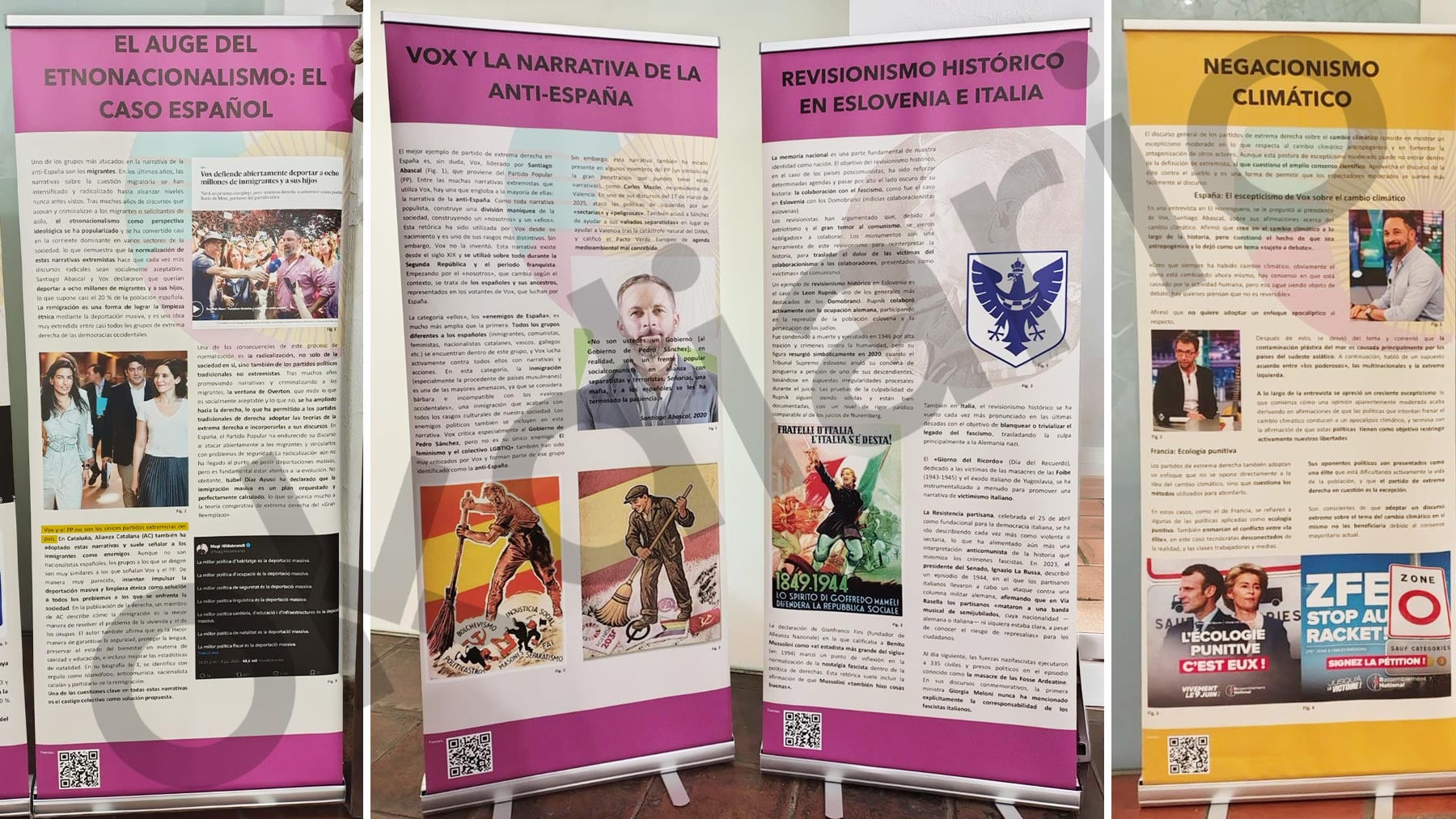 Es en esa adaptación española donde la muestra, costeada por el Gobierno de Sánchez, habla de «Vox y la narrativa anti-España», relacionando al partido de Abascal con el «fascismo italiano», «el negacionismo climático» o el «auge del etnonacionalismo». Esta iniciativa también ha sido promovida por la Cátedra de Memoria Democrática de la Universidad de Córdoba (UCO).