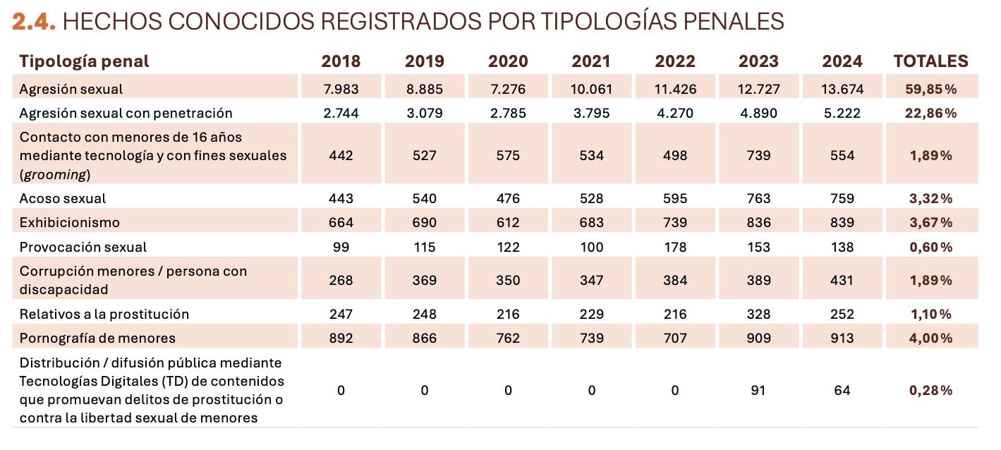 Por tipologías penales, en 2024 hubo hasta 13.674 agresiones sexuales (59,85%) y 5.222 agresiones sexuales con penetración (22,86%). Otras tipologías penales registradas son el contacto con menores de 16 años mediante tecnología y con fines sexuales –grooming–, con 554 (1,89%); el acoso sexual, con 759 hechos (3,32%), exhibicionismo, con 839 (3,67%), provocación sexual, con 138 (0,60%), corrupción de menores/persona con discapacidad, con 431 (1,89%), los relativos a la prostitución, suman 252 (1,10%), y la pornografía de menores (913) y distribución/difusión pública mediante tecnologías digitales de contenidos que promueven delitos de prostitución o contra la libertad sexual de menores, un total de 913 hechos (4%).