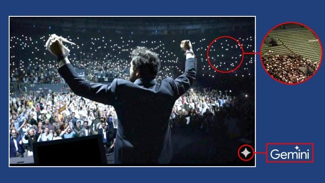 La imagen promocional del acto muestra a Alvise de espaldas, brazos en alto, frente a lo que parecería una marea humana entusiasta. El problema es que esa marea incluye cientos de puntitos blancos flotando en el aire, supuestamente teléfonos móviles con las linternas encendidas. Pero un vistazo más cercano revela la trampa al compararse con la imagen real: son generaciones artificiales, con patrones repetitivos y el sello de Gemini en la esquina inferior derecha para que no queden dudas.