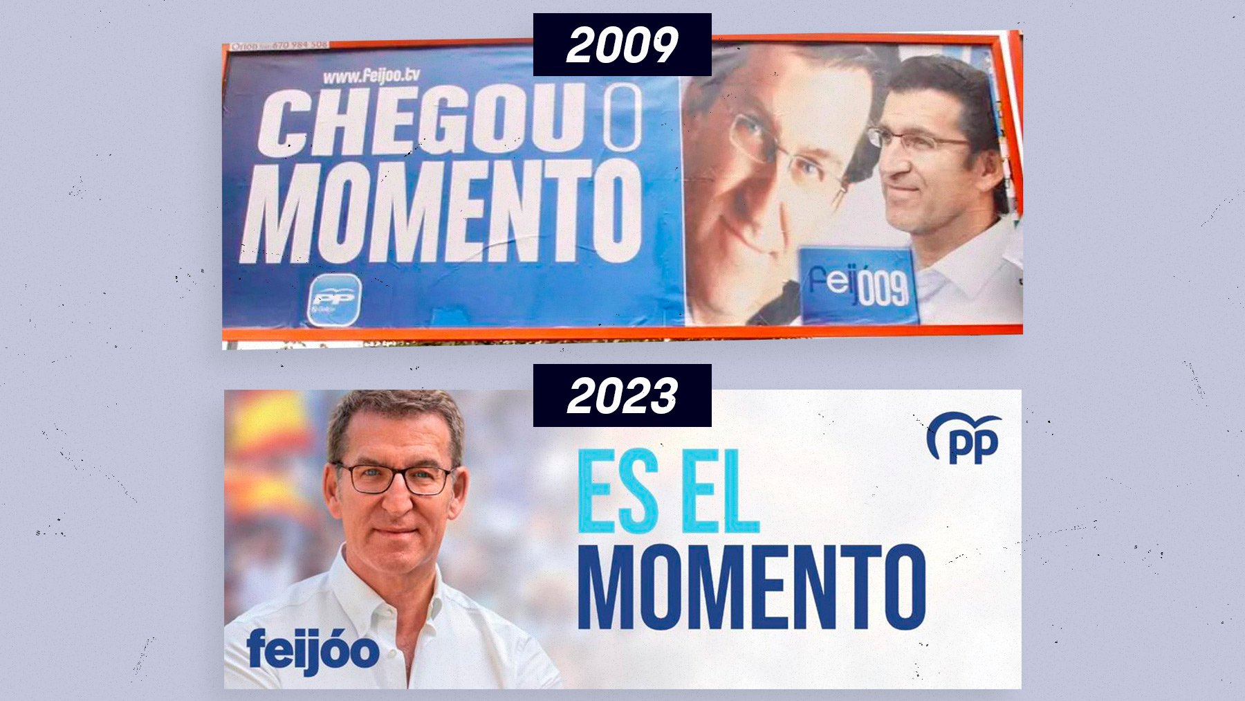 El candidato del PP a la presidencia del Gobierno de España, Alberto Núñez Feijóo, ha escogido como lema de campaña el mismo que le llevó a cosechar la primera de sus cuatro mayorías absolutas en Galicia en 2009. «Es el momento» es la frase con la que Feijóo quiere repetir la hazaña de hace catorce años, cuando su lema fue «Chegou o momento» (Llegó el momento).