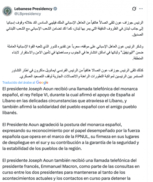 La llamada del Rey Felipe VI se ha producido después de varios días de bombardeos de Israel a la zona de Líbano controlada por los terroristas de Hezbolá, financiados por Irán para atacar a Israel. Hezbolá se encuentra en el sur de Líbano, los suburbios del sur de Beirut y a lo largo de la frontera con Israel. Asimismo, Aoun recibió una llamada del presidente francés Emmanuel Macron, en el marco de consultas bilaterales para seguir la evolución del conflicto y frenar la escalada militar.