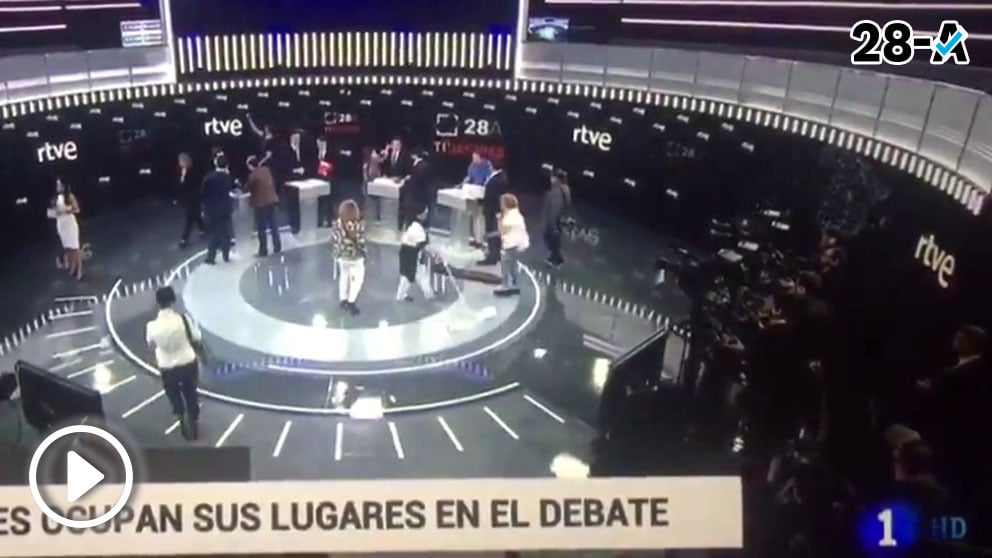 Dos mujeres de la limpieza sacando brillo al plató del debate mientras los cuatro candidatos estaban recibiendo las últimas instrucciones de sus asesores. Así es la imagen que pasó desapercibida en el debate a cuatro de este lunes organizado por TVE, cuya administradora única es la periodista Rosa María Mateo, nombrada en este puesto por Pedro Sánchez desde el pasado verano. Los candidatos también recibieron los últimos toques de maquillaje mientras ocurría esto.