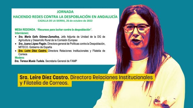 Que la «militante» Leire no era ninguna desconocida lo prueba su participación en distintos eventos. En 2022, y en su condición de directora de Relaciones Institucionales y Filatelia de Correos -presidido entonces por Juan Manuel Serrano, íntimo amigo de Pedro Sánchez- Díez fue ponente de una mesa redonda sobre Recursos para luchar contra la despoblación junto a Juana López Pagán, directora general de Políticas contra la Despoblación del Ministerio para la Transición Ecológica. El acto formaba parte del programa de la jornada Haciendo redes contra la despoblación en Andalucía, celebrada en Cazalla de la Sierra (Sevilla), en octubre de aquel año.