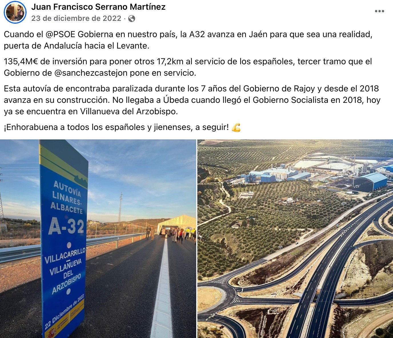«Cuando el el PSOE gobierna en nuestro país, la A-32 avanza en Jaén para que sea una realidad, puerta de Andalucía hacia el Levante. 135,4 millones de euros de inversión para poner otros 17,2 kilómetros al servicio de los españoles, tercer tramo que el Gobierno de Sánchez pone en servicio», destacó el diputado socialista por Jaén en diciembre de 2022, coincidiendo con la puesta en servicio.