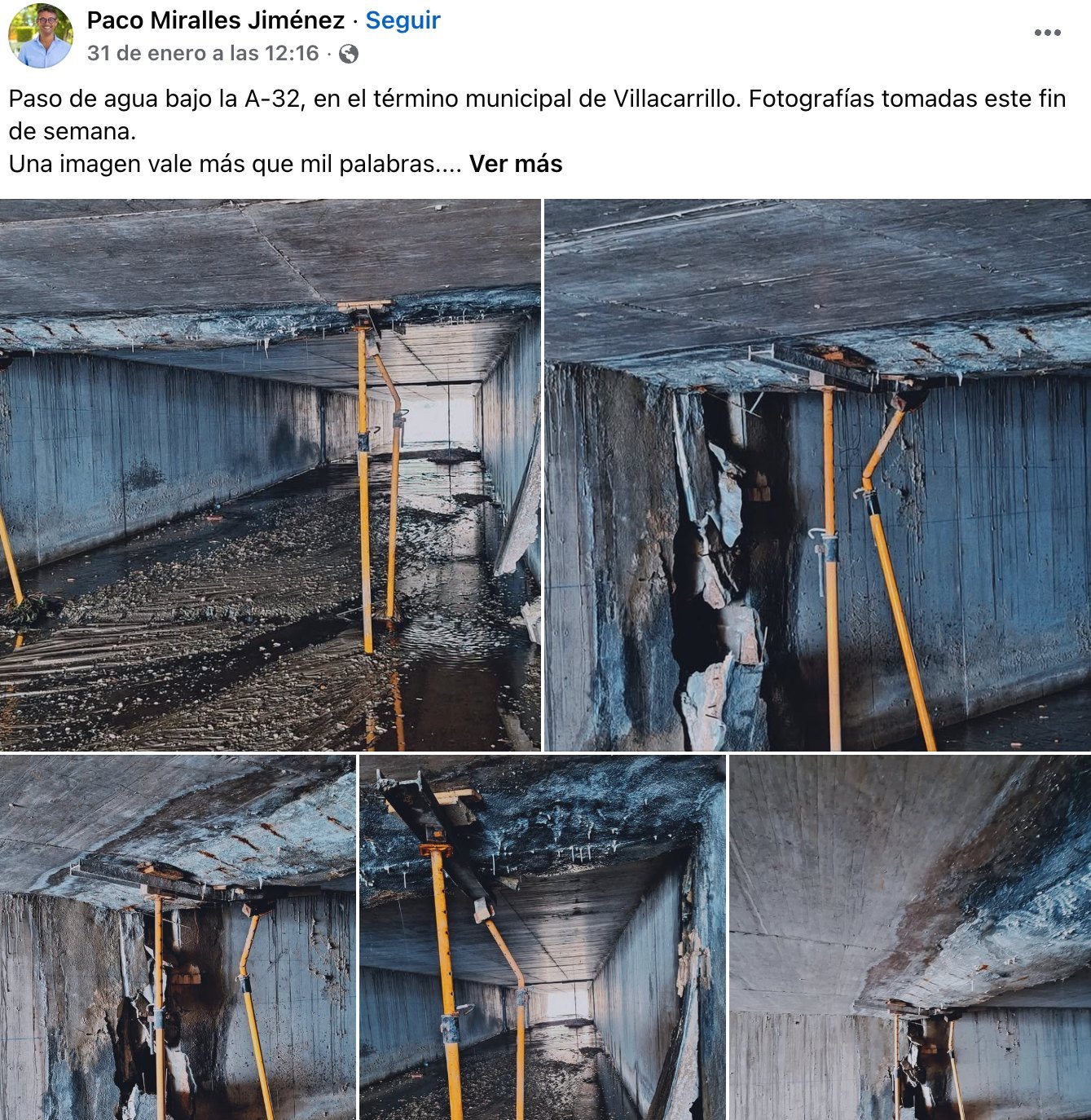 «Paso de agua bajo la A-32, en el término municipal de Villacarrillo. Una imagen vale más que mil palabras. No somos técnicos. Pero tampoco somos ingenuos. ¿Alguien puede ver estas imágenes y decir, con tranquilidad, que aquí no pasa nada?», publicó el regidor en un mensaje en redes el pasado 31 de enero, es decir, antes del fuerte temporal que azota esta semana Andalucía con la borrasca Leonardo.