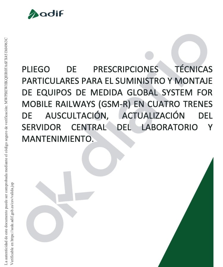 Este pliego especifica que la actuación tiene como objetivo el «suministro e instalación de equipos de medida de GSM-R embarcados en el nuevo tren auscultador de alta velocidad fabricado por Talgo, así como su mantenimiento durante cuatro años; el suministro e instalación de equipos de medida de GSM-R embarcados en los tres nuevos trenes auscultadores fabricados por la UTE Stadler Rail-Mermec, así como su mantenimiento durante cuatro años; y la actualización del servidor central instalado en el Laboratorio de Villaverde y del respondedor, así como su mantenimiento durante cuatro años».