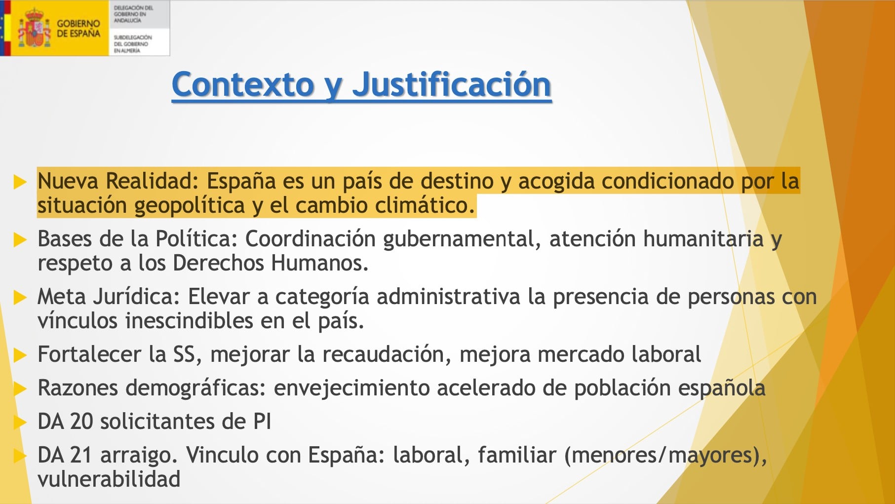Bajo el epígrafe Contexto y Justificación, el power point recogió en primer lugar el siguiente fundamento: «Nueva Realidad: España es un país de destino y acogida condicionado por la situación geopolítica y el cambio climático».